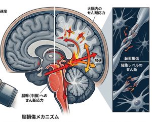 頭部に加速度が加えられると、頚椎に固定されている脳幹と大脳を繋ぐ神経組織は強制的に引き伸ばされます(せん断応力)。